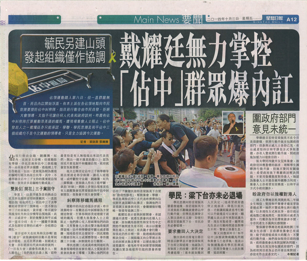 地元紙『星島日報』『東方日報』によると、デモを指揮しているのはもはや、セントラル占拠の発起人ではないのは、すでに分かっています。(発起人はここまで大規模になると予想していなかったようです)