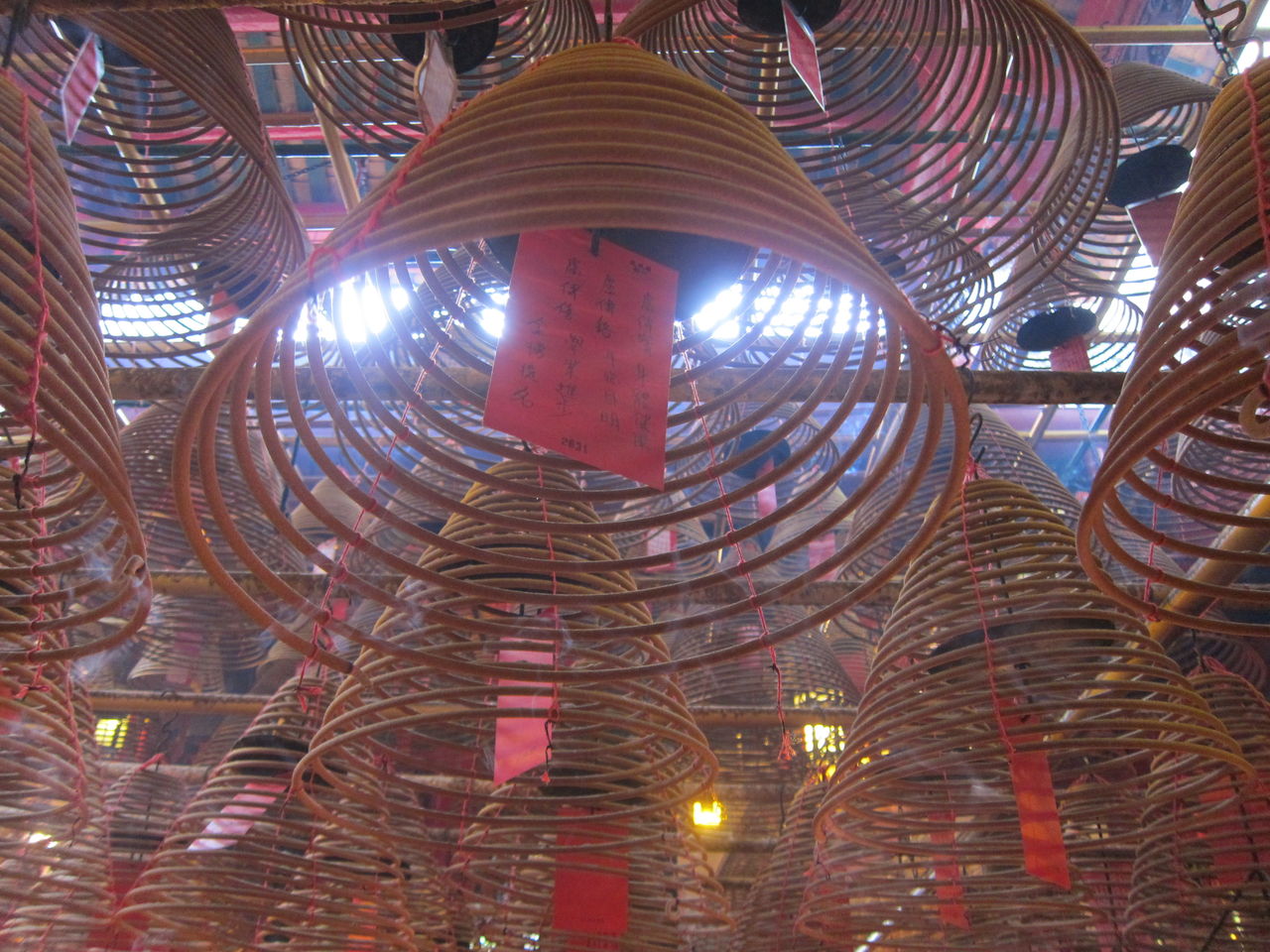 この寺院、渦巻き線香が有名で、線香のなかに願い事の紙を吊るし